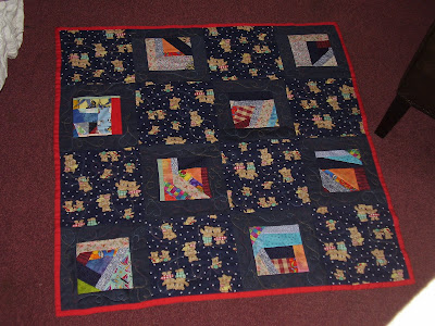 The day was thoroughly enjoyable, relaxed and friendly, I made a new friend or two and selected a pack of random patches organised by Lynda. My crazy patchwork panels were colourful and bright in some very child-friendly colours and fabrics. I sashed them to make them stand out and added a simple patch of teddies to contrast with the busy-ness of the crazy patches.